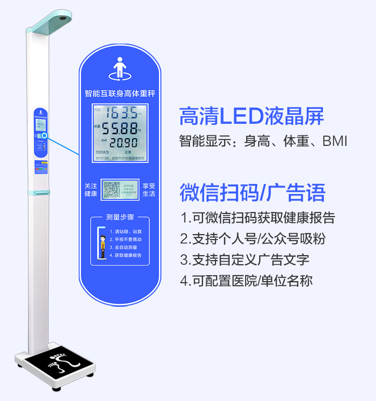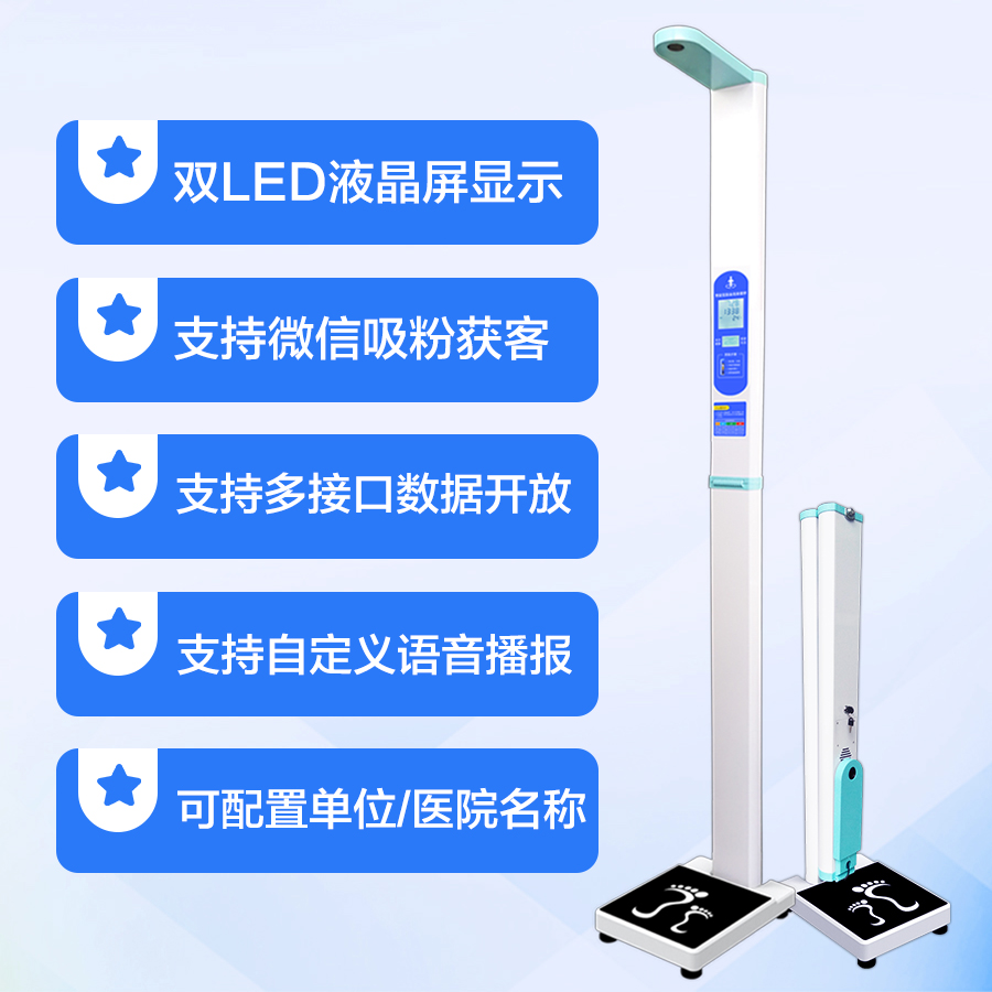 上禾SH-201智能雙屏身高體重測量儀,適合90%以上的春季體檢使用場景,雙屏顯示、可折疊、可設(shè)置您的專屬宣傳語、全自動測量、語音播報(bào)、數(shù)據(jù)傳輸?shù)龋胍墓δ埽加校?/p>
